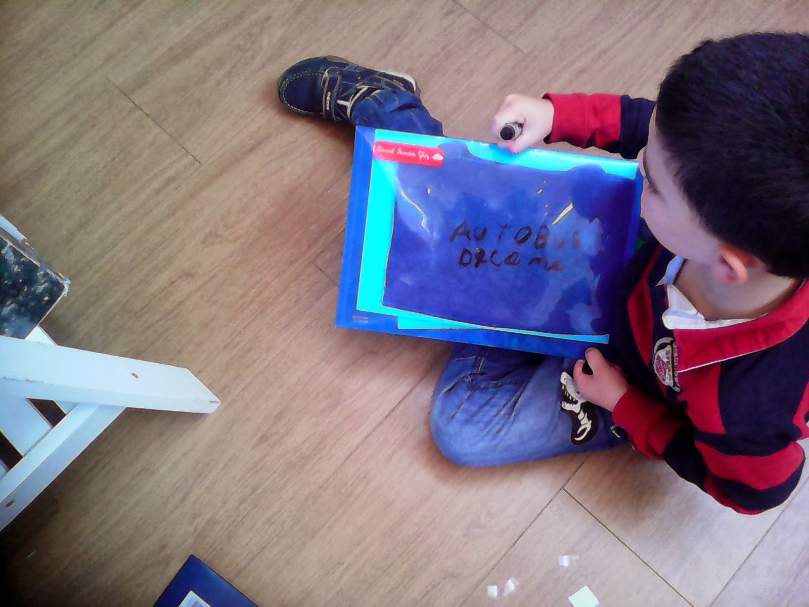 Hemos necesitado : Cartulina roja (para los autobuses), cartulina azul para las unidades, velcro y papel de plastificar, también hemos confeccionado números con una plantilla para establecer una estructura de descomposición.