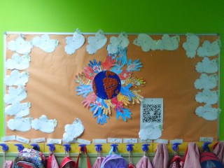 Además de nuestros banderines para lucir el día de la paz, hemos realizado un mural en la puerta de la clase, interactivo…!si si !…con un código Qr que nos lleva al vídeo que he preparado con la canción que tanto nos gusta. La tierra la hemos hecho con plastilina y mucho amor.