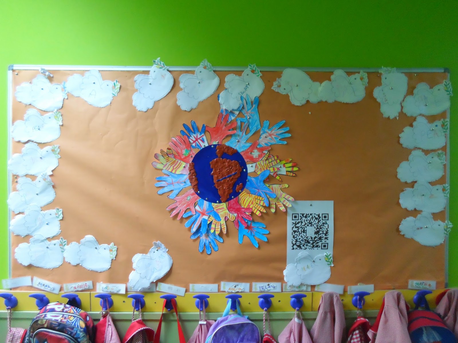 Además de nuestros banderines para lucir el día de la paz, hemos realizado un mural en la puerta de la clase, interactivo…!si si !…con un código Qr que nos lleva al vídeo que he preparado con la canción que tanto nos gusta. La tierra la hemos hecho con plastilina y mucho amor.